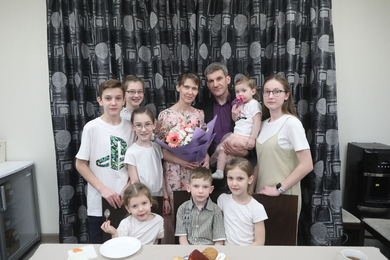 Большой дом, расположенный в поселке Стрельна, насчитывает три этажа. Сегодня он наполнен домашним уютом и готов принимать гостей. Хозяйка дома Татьяна и глава семейства Евгений Тюкаевы встречают гостеприимно – горячим чаем и тортом. С радостью и улыбками встречают и дети. Их в семье девять – три сына и шесть дочерей. Старшей дочке 15 лет, младшему сыну 2 месяца.