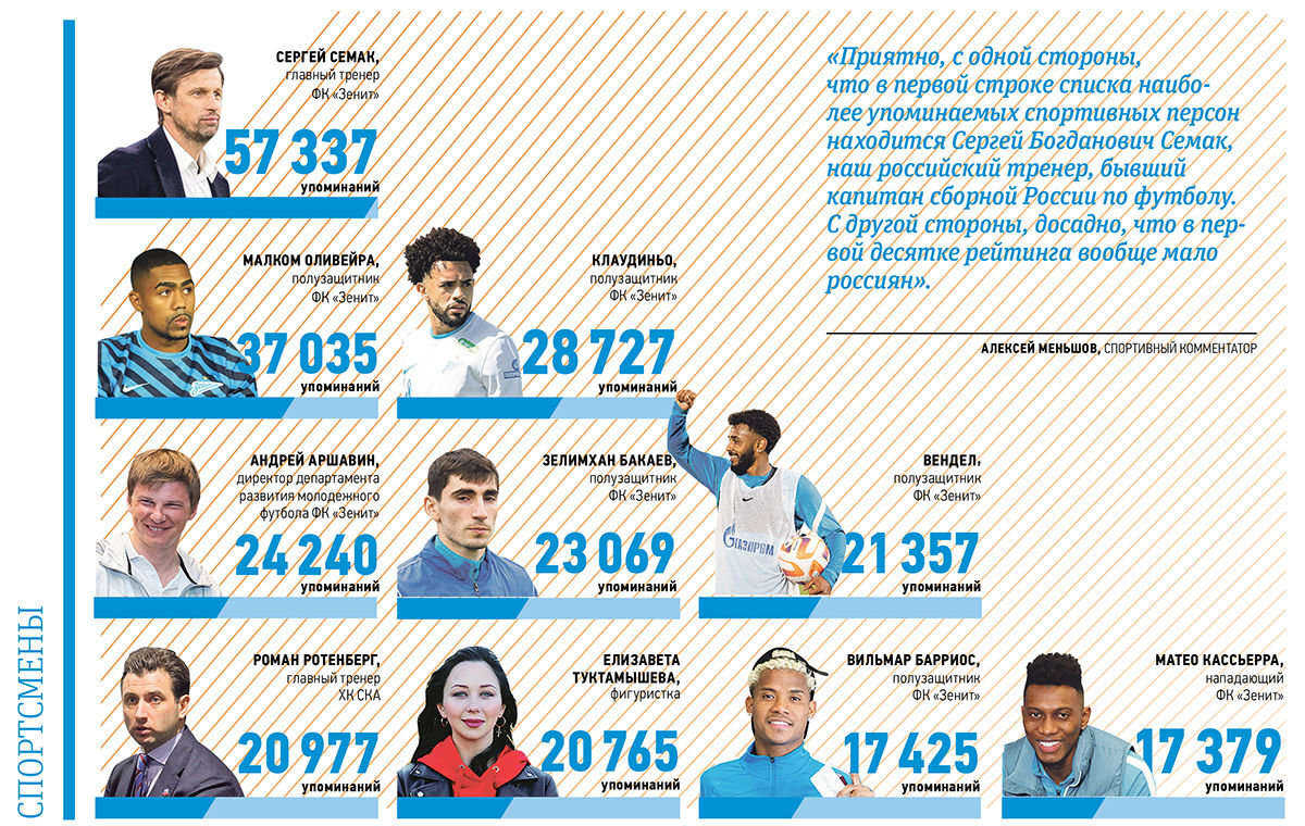 – Приятно, с одной стороны, что на первой строке списка наиболее упоминаемых спортивных персон находится Сергей Богданович Семак – наш российский тренер, бывший капитан сборной России по футболу. Наставник «Зенита» все время в центре внимания, команда под его руководством показывает зрелищную игру, добивается результатов.