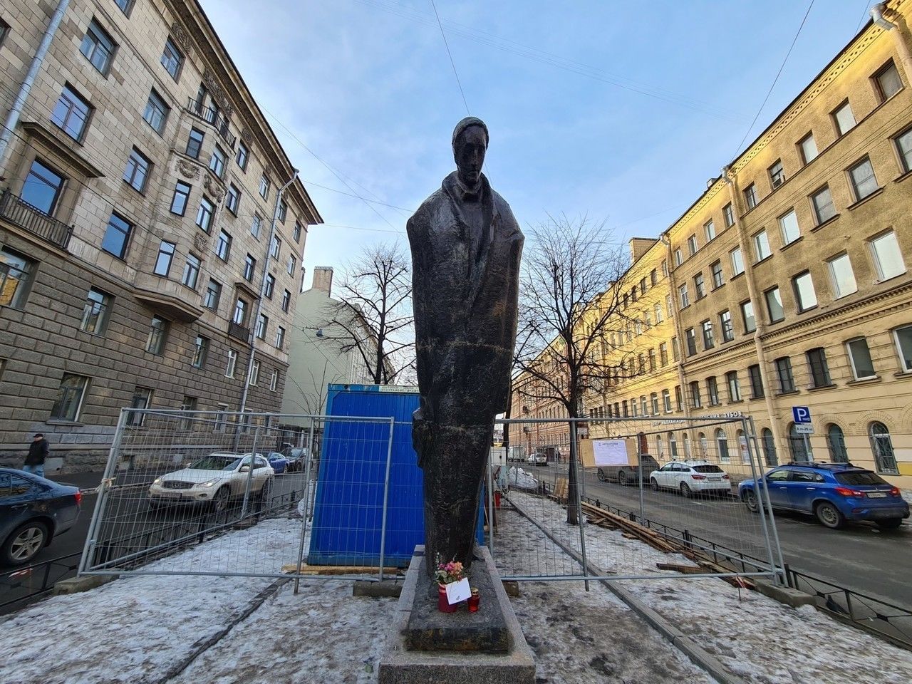 Евгений Ротанов и архитектор Иван Кожин буквально воткнули или вонзили, а не просто поставили памятник перед оживленным перекрестком. Превращенная в музей квартира Блока, где он прожил свои последние дни, осталась за плечами четырехметрового монумента. Если подходить к этому месту по Английскому проспекту со стороны канала Грибоедова, то внезапно выглядывающая из‑за угла наклонная статуя действительно может испугать. Четыре метра практически без постамента вырастают будто из самой земли. Не человек, а нависающая тень. Вот-вот бронзовый гигант раздавит… Но подойдите ближе – и тяжелое впечатление исчезнет. Перед вами печальный господин в пальто, чье неотмирное лицо устремлено куда‑то поверх городской суеты. Фигура скорее готова оторваться от земли, чем упасть. Кажется, что она еле касается тротуара и вот-вот воспарит. Конечно, тень, а не ангел. Но Блок отнюдь не падает.