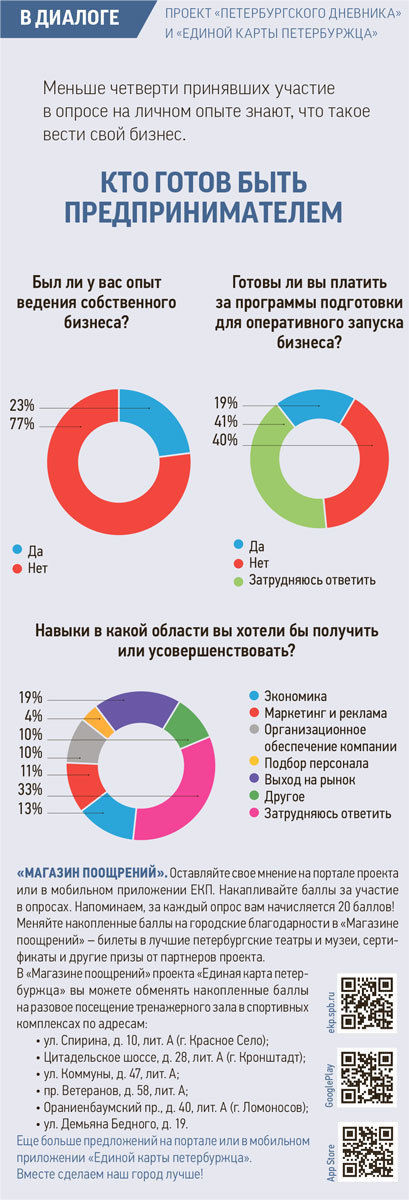 Лишь 23 процента петербуржцев имеют опыт ведения собственного бизнеса. Об этом свидетельствуют результаты опроса, проведенного «Петербургским дневником» и «Единой картой петербуржца».