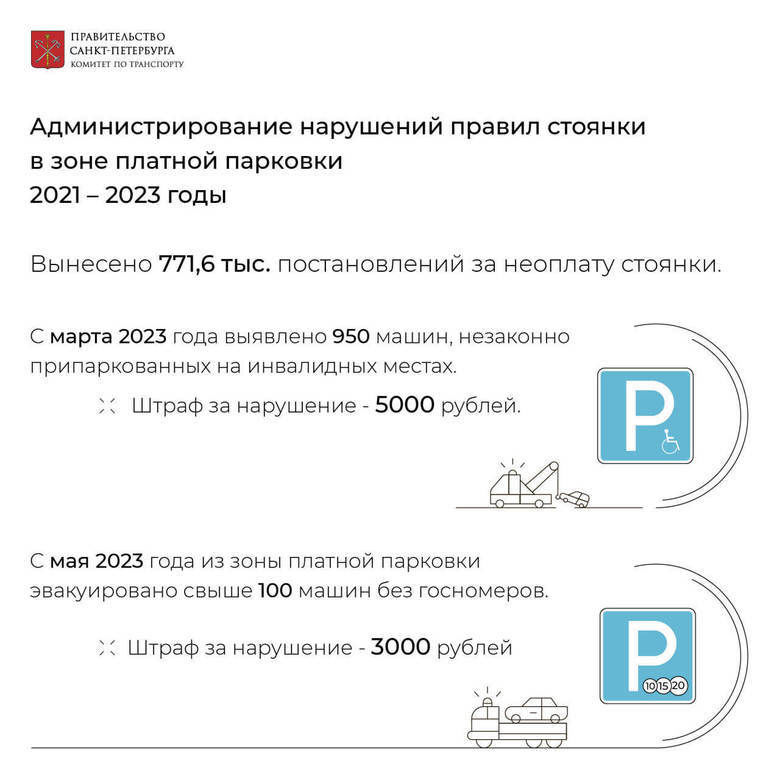 Напомним, с 29 июня 2021 года Комитету по транспорту от МВД России перешли полномочия по администрированию правонарушений в сфере парковки транспортных средств на территории Петербурга. Также ведомство администрирует нарушения правил пользования зоной платной парковки.