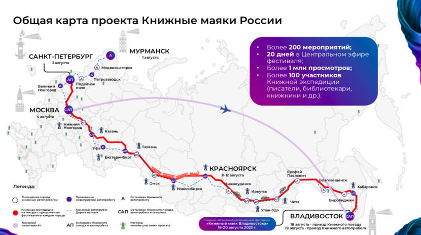 Пассажирами поезда и одновременно проводниками в мир современной литературы станут популярные писатели, поэты, актеры, блогеры и журналисты, а также издатели, библиотекари и ученые. Цель этого проекта, стартующего в ходе открывшегося недавно фестиваля «Книжный маяк Петербурга», – возрождение у россиян вкуса к чтению книг и реанимация понятия «хорошая литература». Именно поэтому по пути следования поезда в 14 крупных городах предусмотрены остановки на день.