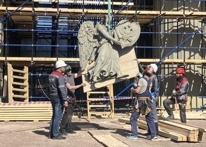 Реставраторы приступили к восстановлению крылатых гениев с Московских триумфальных ворот. Об этом сообщает пресс-служба КГИОП.