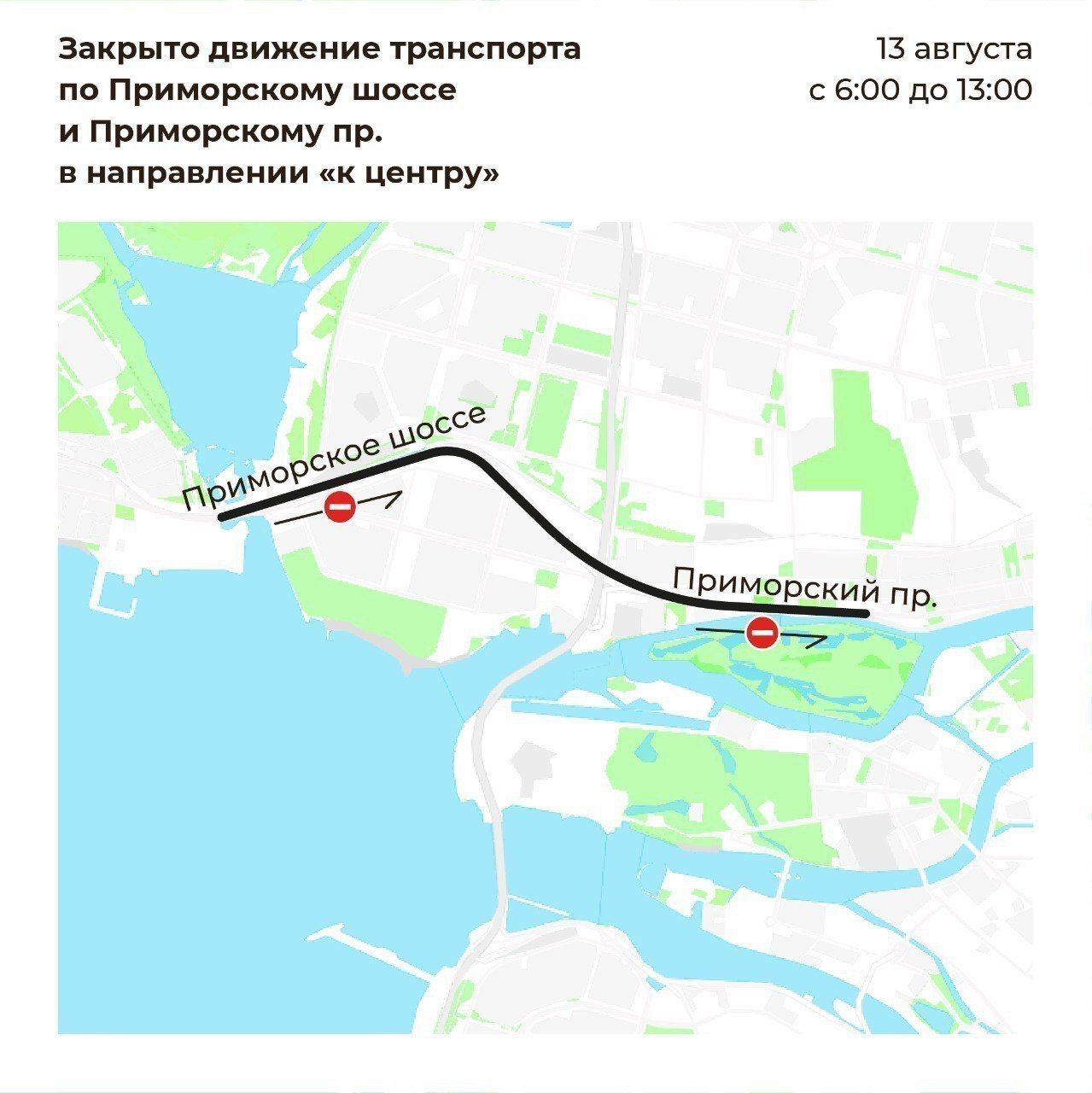 Так, с полуночи до 13:00 запретят остановку на Приморском проспекте у 3-го Елагина моста, с 6:00 до 13:00 прекратят движение по Приморскому проспекту в направлении от улицы Савушкина (у Планерной) до дома 65, а также по Приморскому шоссе в направлении от улицы Савушкина (у «Лахта Центра») до участка у Планерной.