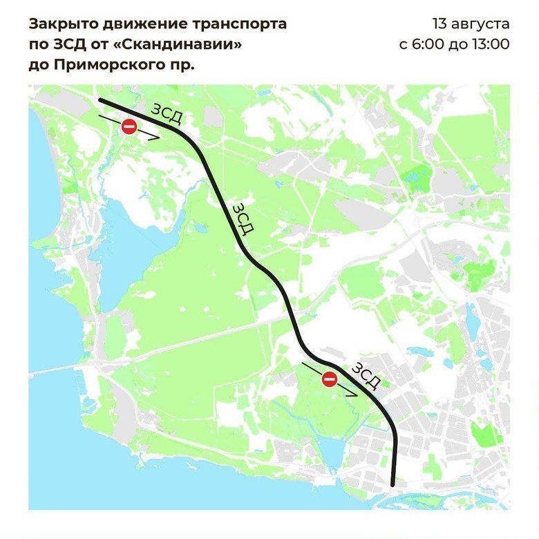 Кроме того, с 6:00 до 13:00 ограничат движение транспорта по ЗСД от съезда с трассы Е-18 «Скандинавия» на ЗСД до съезда с ЗСД на Приморский проспект.
