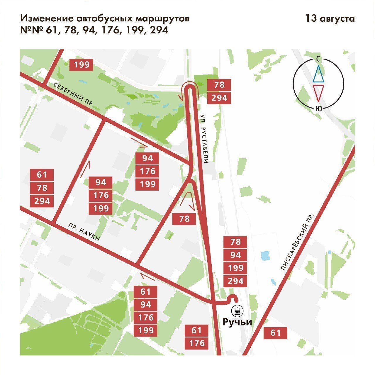Автобус №199 будет идти от «Ручьёв» до проспекта Науки, по улице Софьи Ковалевской, Северному проспекту и до Толубеевского проезда, автобус №294 – от «Ручьёв» по улице Руставели, Северному проспекту и до метро «Старая Деревня».