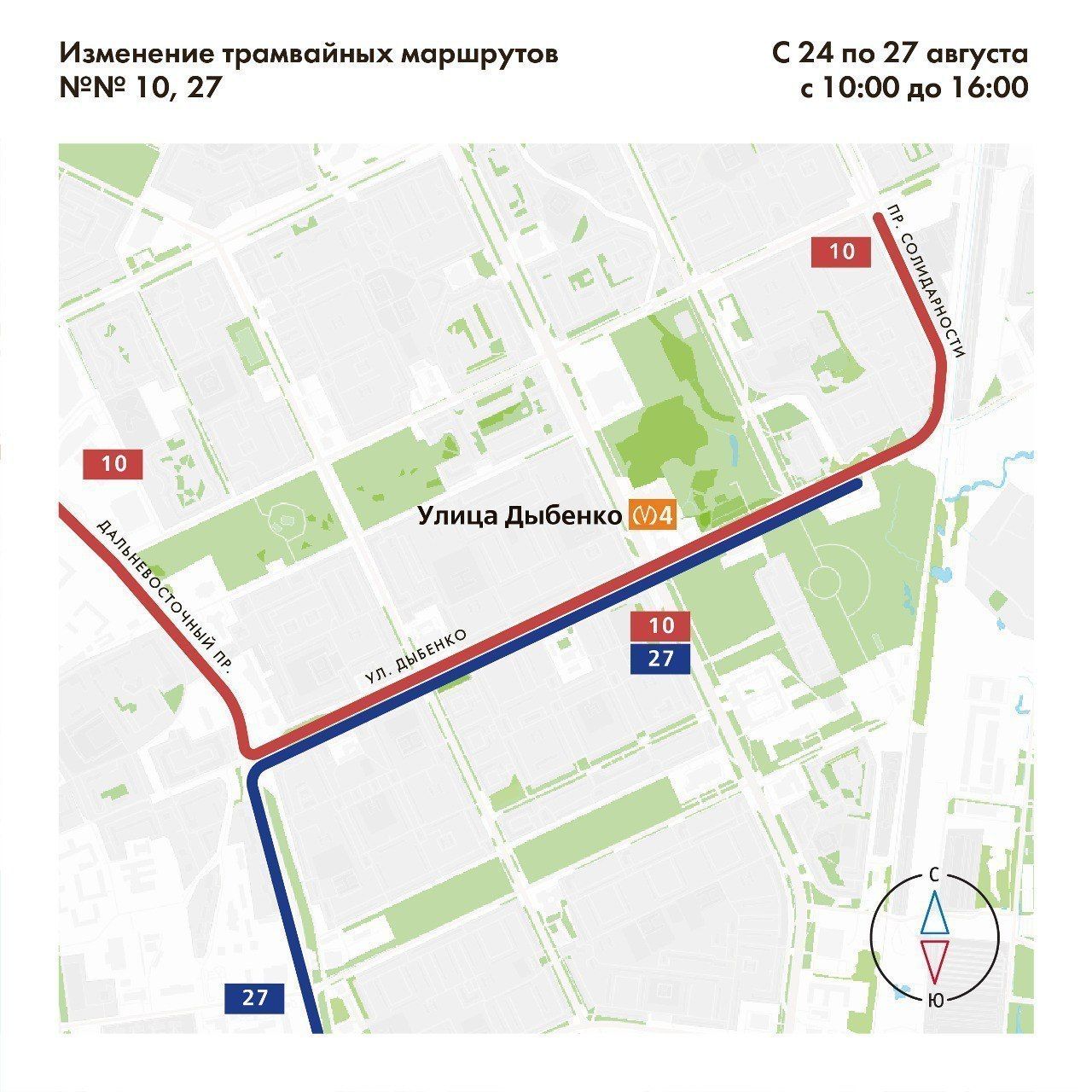 Так, трамвай №10 будет следовать по проспекту Солидарности, улице Дыбенко, Дальневосточному проспекту и по действующей трассе, трамвай №27 – по той же трассе от реки Оккервиль. Трамваи №65 и А в указанные часы работать не будут.