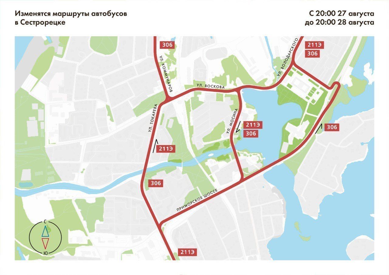 С 20:00 27 августа до 20:00 29 августа автобусы №211Э, 306, 307, 309, 311, 312 в Сестрорецке направлены по изменённым трассам.