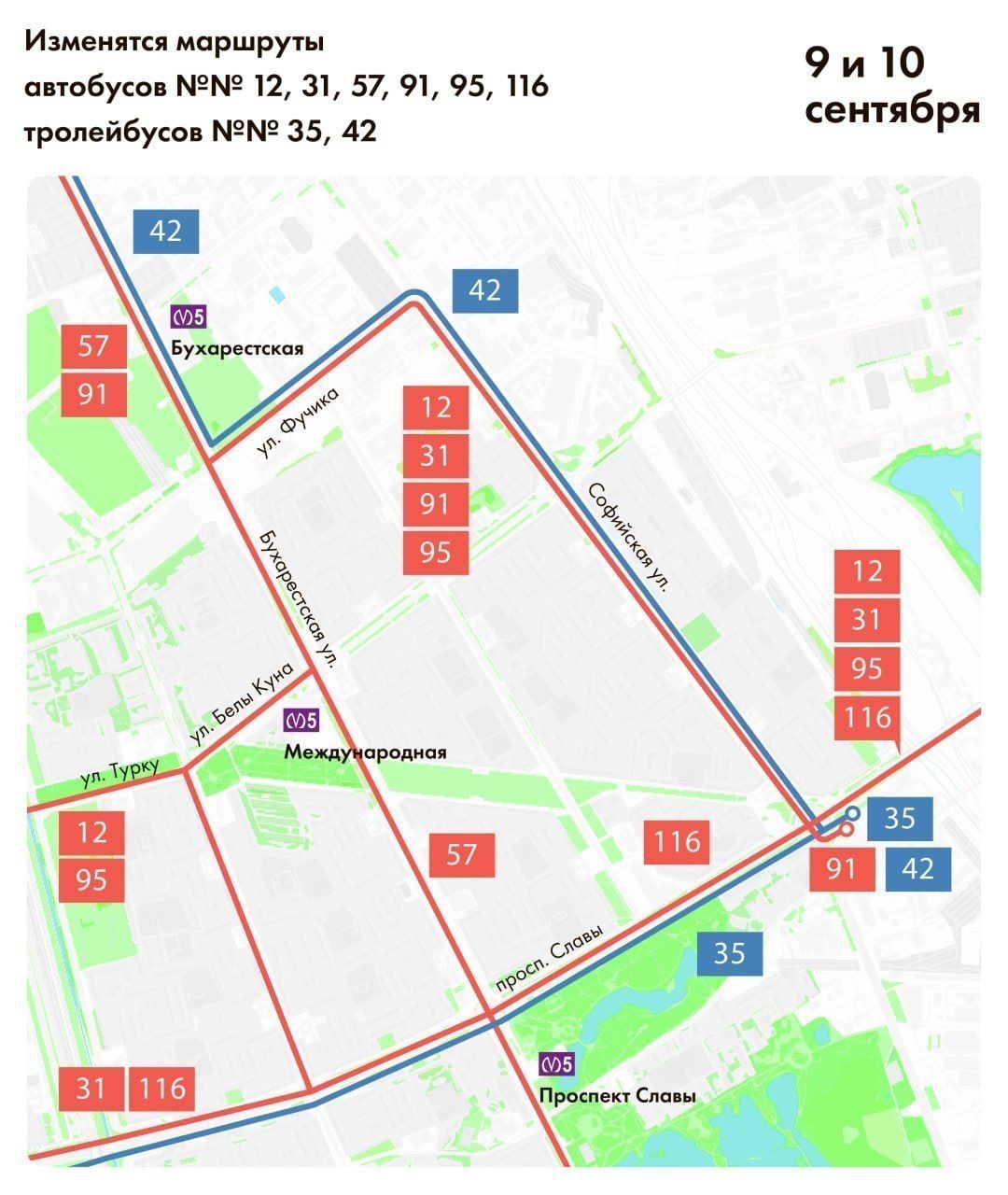Работы будут проводиться на Пражской улице от улицы Фучика до улицы Белы Куна, включая перекресток с улицей Турку. В связи с этим 9 и 10 сентября вводятся изменения маршрутов автобусов № 12, 31, 57, 91, 95, 116, а также троллейбусов № 35 и 42. Маршруты обхода участка можно увидеть на схеме.