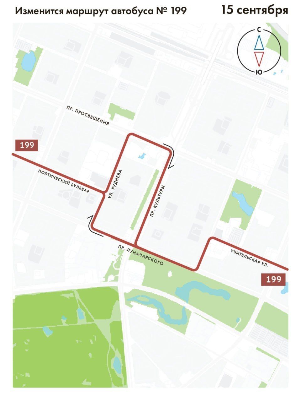 Так, автобус будет курсировать от конечной остановки «Толубеевский проезд» по действующей трассе до улицы Руднева, далее – по проспекту Просвещения и по действующей трассе до конечной остановки «Ручьи».