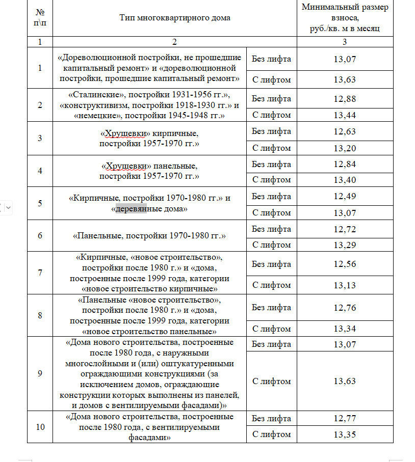 В соответствии с документом, размер платы за капитальный ремонт будет зависеть от типа дома, а также наличия лифта. Так, меньше всего придется платить владельцам квартир в кирпичных домах постройки 1970-1980 годов и деревянных домов – 12,49 рубля. С жильцов панельных хрущевок постройки 1957-1970 годов будут брать 12,84 рубля с квадратного метра.