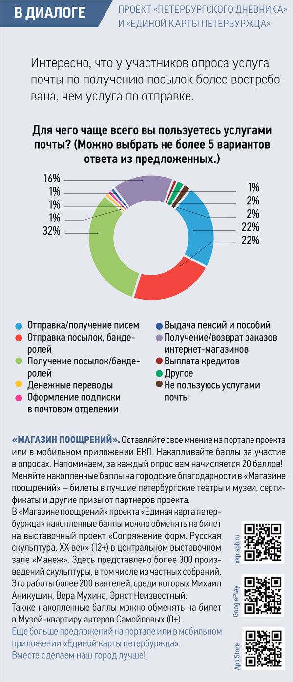 Петербуржцы чаще всего пользуются услугами почты для отправки и получения писем и посылок – причем получением чаще, чем отправкой. Об этом свидетельствуют результаты опроса, проведенного «Единой картой петербуржца» и «Петербургским дневником».