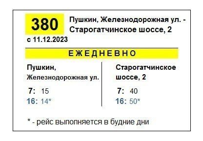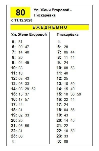 Как сообщили в пресс-службе «Организатора перевозок», с 11 декабря изменится расписание движения двух автобусов – №80, который ходит от улицы Жени Егоровой до Пискаревки, и №380 в Пушкине, следующего от Железнодорожной улицы до Старогатчинского шоссе, 2.