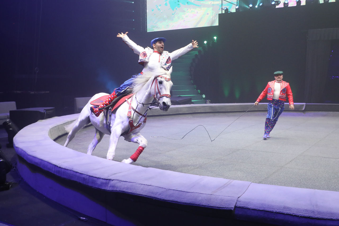 На арену выйдут участники номера «Партерный полет» под руководством Карена Еганяна, джигиты на конях под управлением Олега Танделова, акробаты на подкидных досках под руководством Алексея Зарипова – единственный в мире аттракцион в этом жанре, где выступают девушки-акробаты.