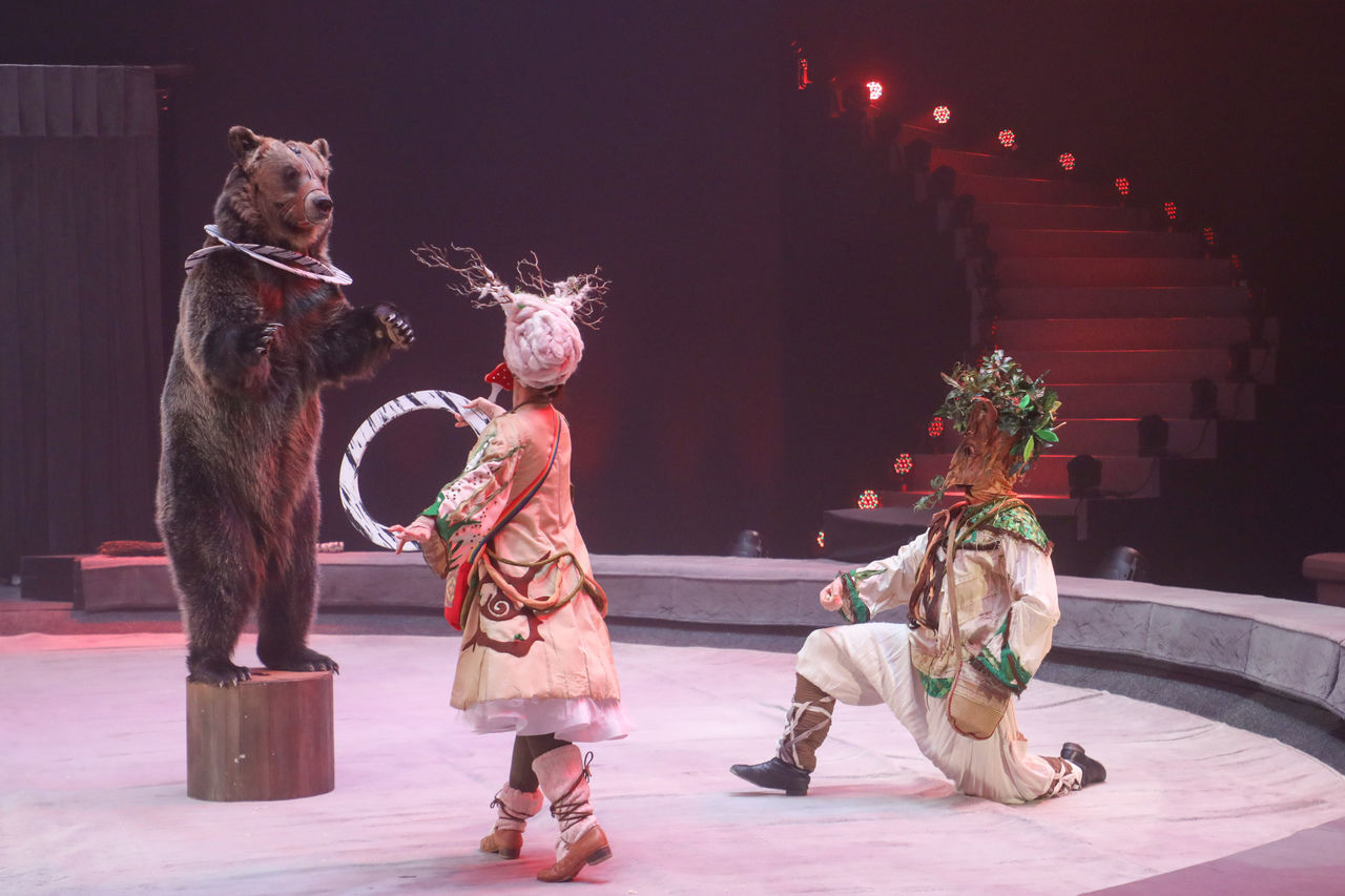 В волшебной постановке задействованы представители практически всех известных цирковых специальностей. Летающие дрова превращаются в акробатов на дорожке, бабки-ёжки с метлами укрощают живых медведей.