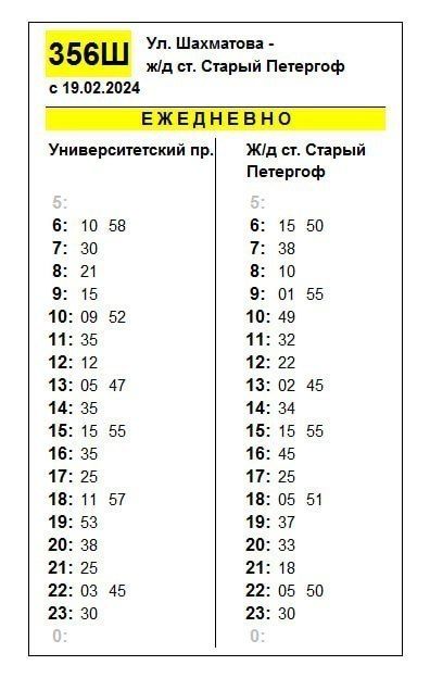Автобус №356Ш будет уходить ежедневно от Университетского проспекта в 6:10, от железнодорожной станции Новый Петергоф – в 6:15.