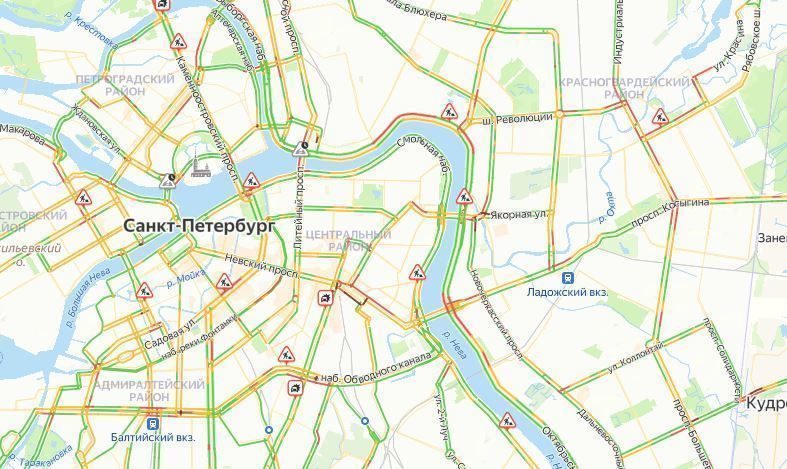 По данным сервиса «Яндекс. Пробки», утром заторы есть на Октябрьской набережной и Заневском проспекте, а также на Лесном проспекте и у станции метро «Обводный канал».