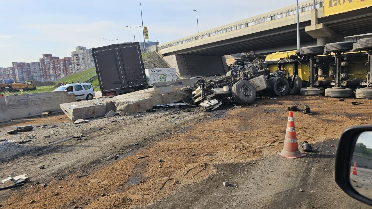 Позже выяснилось, что на трассе столкнулись грузовой фургон и тягач с полуприцепом, груженный песком. Одному из водителей понадобилась медицинская помощь, он госпитализирован.