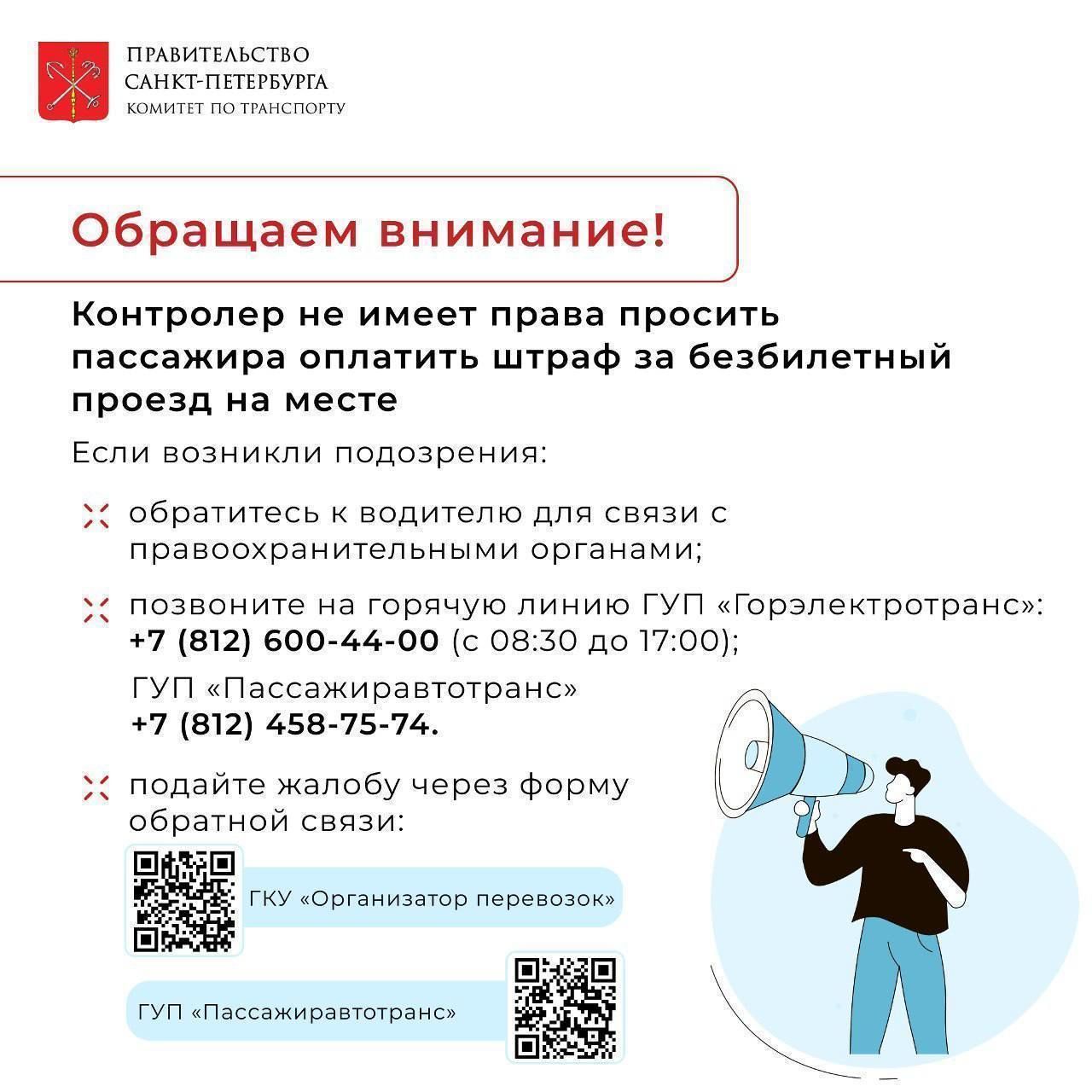 Всего на маршрутах наземного транспорта Петербурга работают более 900 контролёров. Напомним, контролёр не имеет права просить пассажира оплатить штраф за безбилетный проезд на месте.