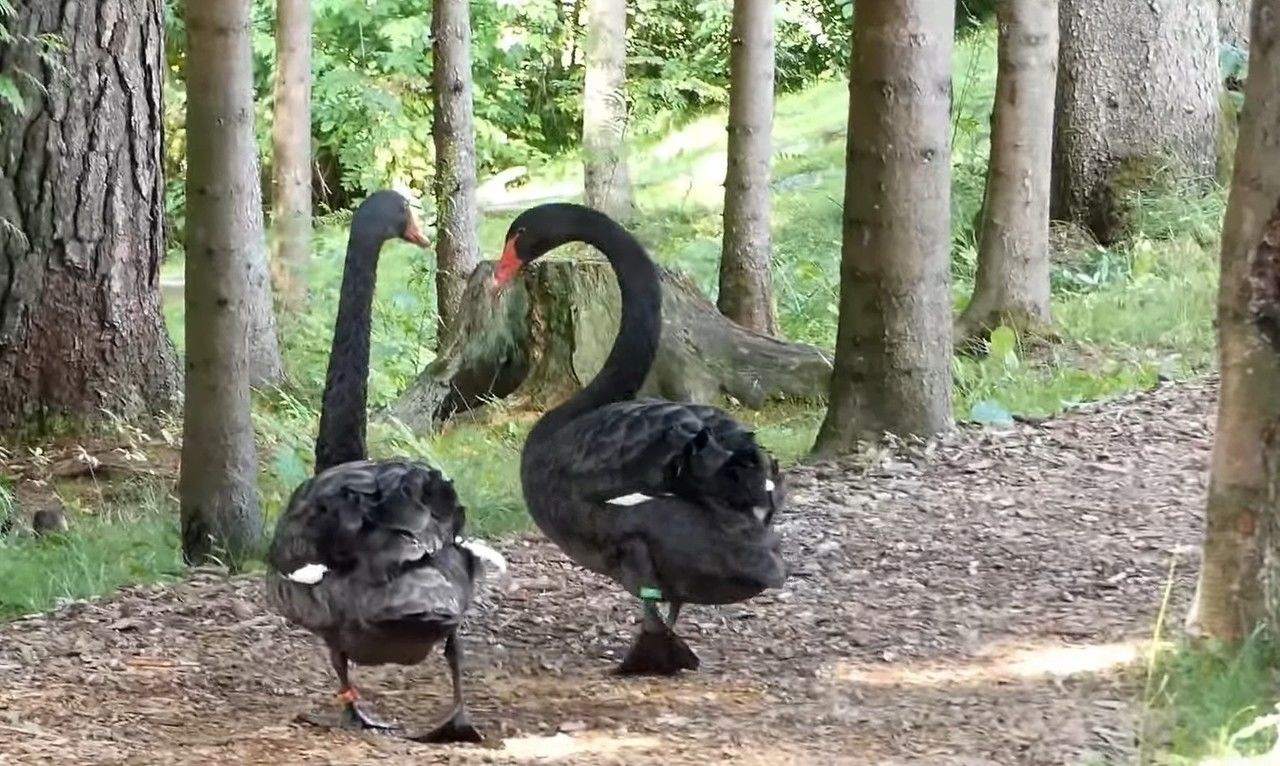 Посетители «Охта Парка» повстречали среди сосен необычных спутников – двух черных лебедей. Птицы покинули водоем и отправились на прогулку во Всеволожском районе Ленинградской области. Об этом сообщает группа «Птицы СПБ и ЛО».