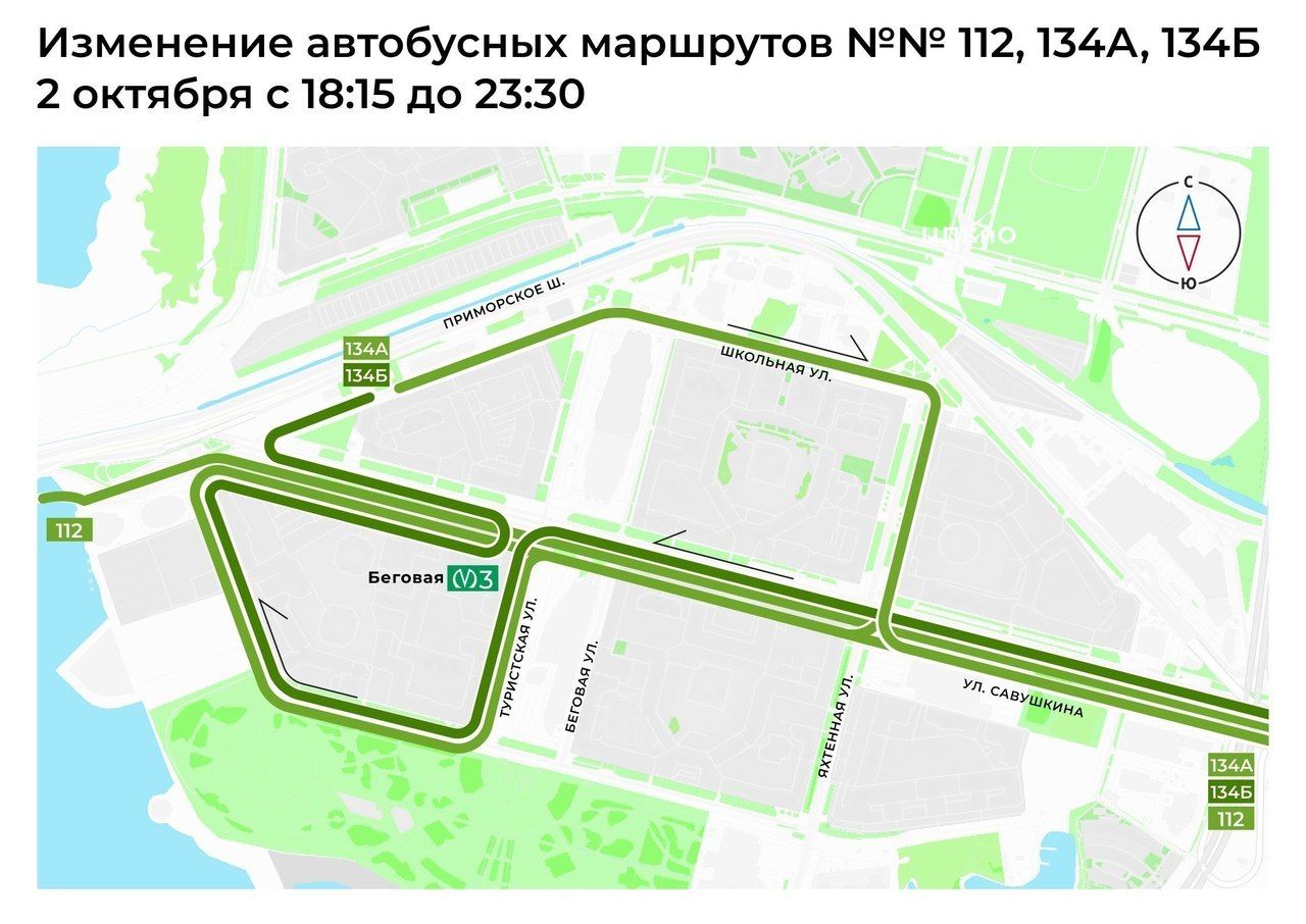 В Петербурге из-за проведения футбольного матча на стадионе «Газпром Арена» 2 октября с 18:15 до 23:30 вносят изменения в организацию движения автобусных маршрутов, сообщили сегодня в пресс-службе «Организатора перевозок».