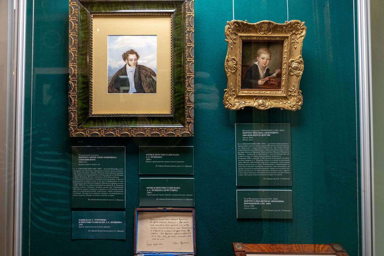 В Зеленом зале на Мойке, 12, представлена копия портрета, выполненная к 100-летию со дня рождения Пушкина племянником Карла Брюллова, математиком, музыкантом и художником Петром Брюлловым. А также живописный эскиз и рисунок итальянским карандашом Тропинина, что позволяет проследить путь художника к знаменитому портрету поэта.