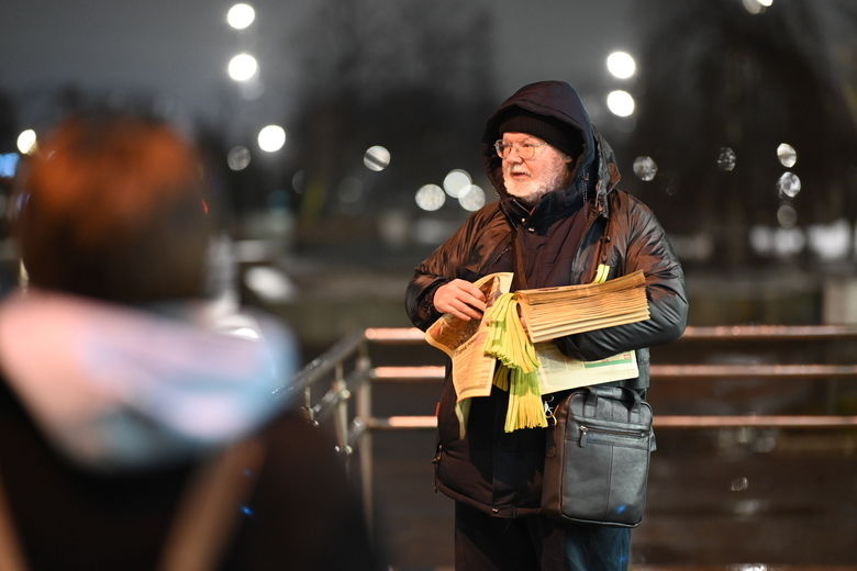 Утром у станции метро «Проспект Славы» руководитель штаба петербургского регионального отделения «Бессмертного полка России» и главный редактор «Петербургского дневника» Кирилл Смирнов вместе с сотрудниками издания раздали специальный номер газеты, посвященный 81-й годовщине полного освобождения Ленинграда от немецко-фашистских захватчиков.