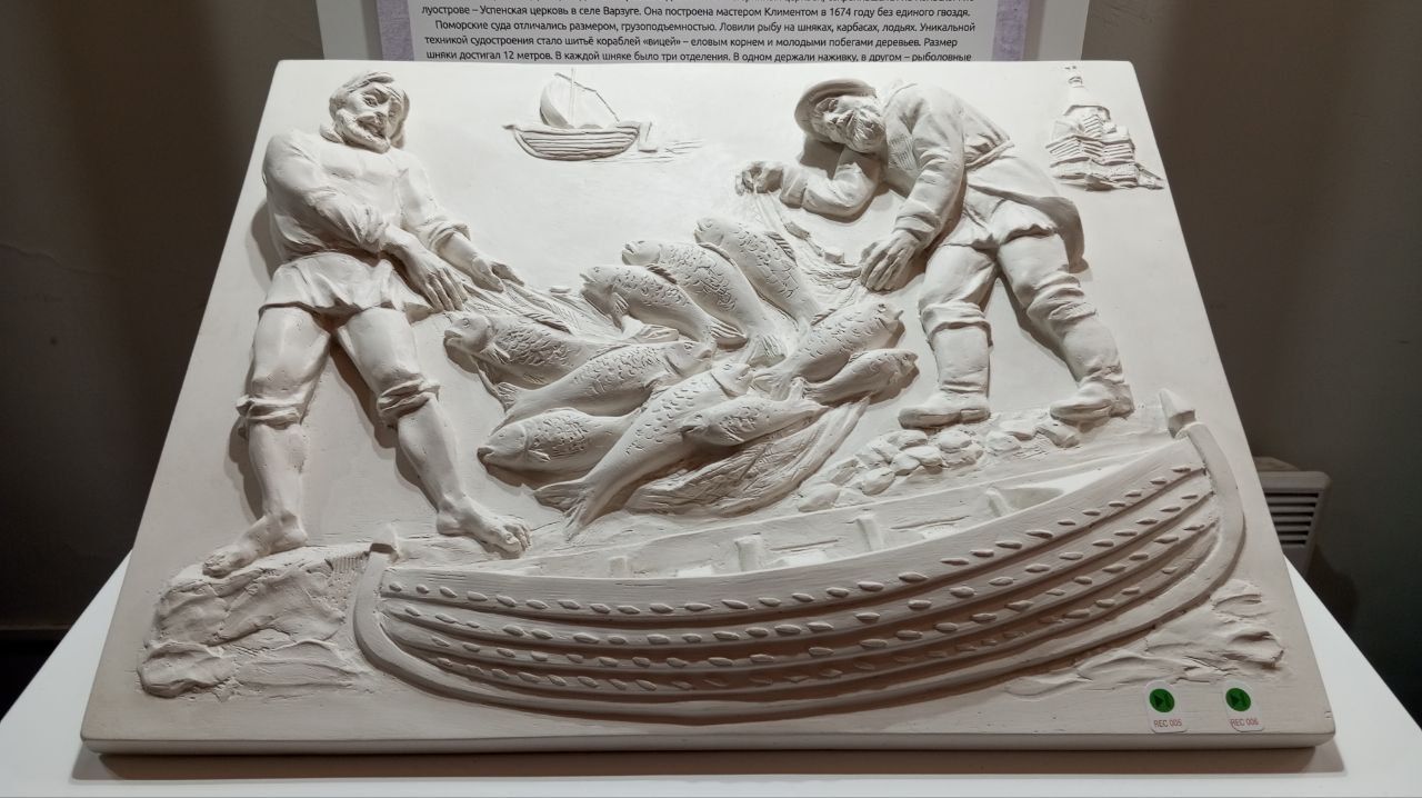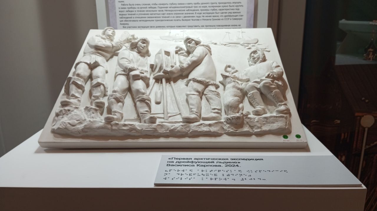 Всего тактильных барельефов на выставке четыре. Они посвящены быту кольских саамов и терских поморов, экспедициям Ивана Папанина на дрейфующей льдине и Георгия Седова на Северный полюс. Еще четыре, среди которых про полет Валерия Чкалова, первый атомный ледокол «Ленин», пока хранятся в запасниках музея, а в будущем они поменяются местами с теми, что сейчас доступны посетителям.