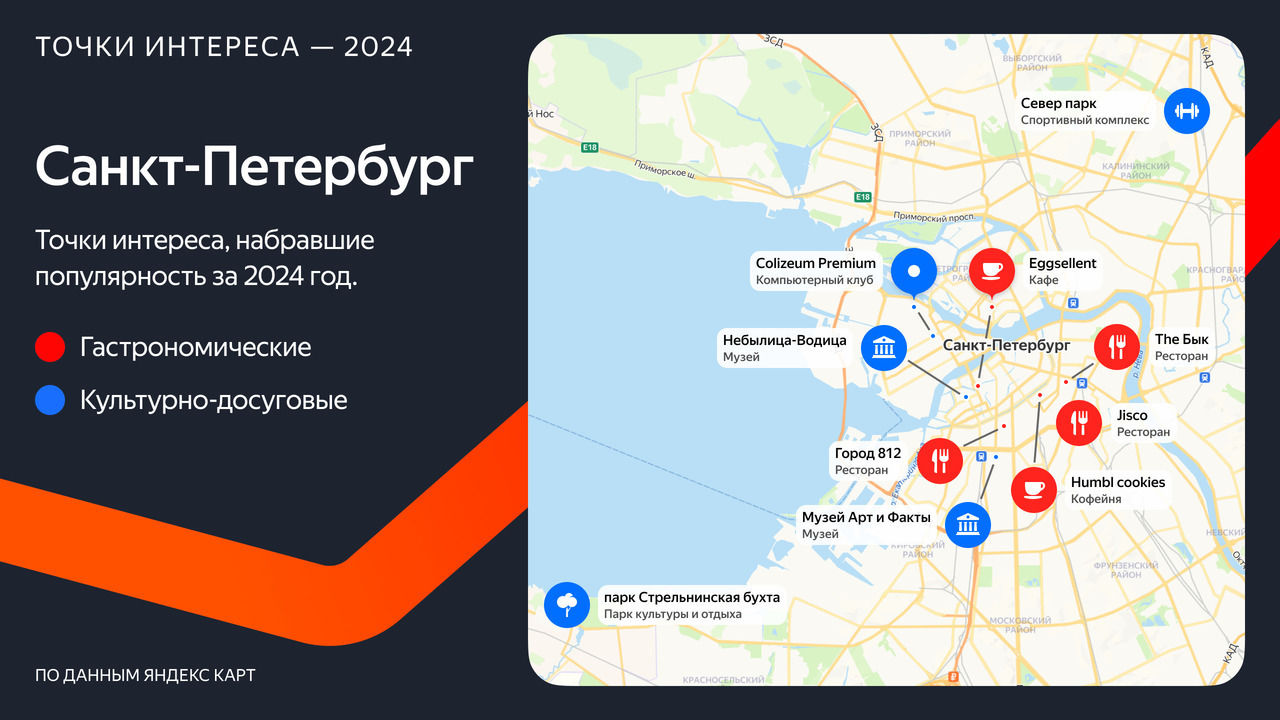 Аналитики сервиса «Яндекс Карты» рассказали, какие места в Петербурге стали самыми интересными для жителей в 2024 году.