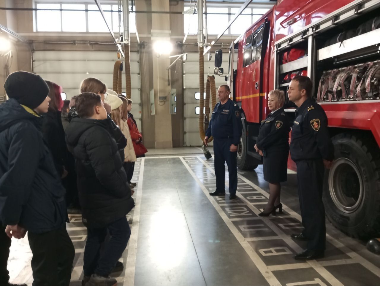 Познакомившись с Валерием Фоменковым, а также с его коллекцией пожарных касок (самой старой из них больше ста лет) и моделями всевозможной противопожарной техники, следующей остановкой стал гараж пожарного отделения. Здесь начальник и заместитель директора подробно рассказали об устройстве пожарной цистерны, подъёмно-спасательного автомобиля и, помимо того, поведали, как их часть принимала участие в тушении горящего склада Wildberries. Этому очагу возгорания был присвоен высший уровень сложности. Также на экскурсию заглянул один из водителей пожарного автомобиля – Антон Билибин, который вместе со своим штурманом является победителем соревнований по скоростному маневрированию на пожарных автомобилях «Трасса-01» прошедшего года. Дабы закрепить знания об устройстве техники, дети смогли побывать за рулём автомобиля службы спасения и ощутить себя водителем «01».