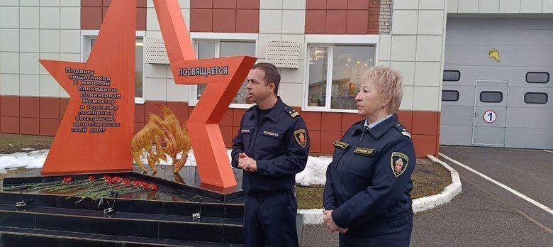 Наше знакомство с пожарно-спасательным отделом начинается с экспозиции стелы. Пятиконечный монумент ярко-оранжевого цвета посвящён мужеству и героизму пожарных во времена блокады Ленинграда. К слову, во время войны работники противопожарной службы, как и все рабочие, получали 250 граммов хлеба.