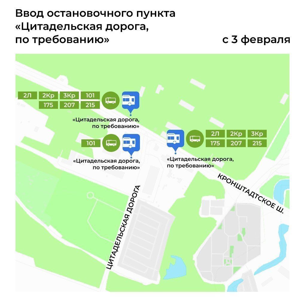 В Петербурге с 3 февраля вводят остановочный пункт «Цитадельская дорога, по требованию» на Кронштадтском шоссе у пересечения с Цитадельской дорогой и переводится в статус «по требованию» остановочный пункт «Цитадельская дорога» на Цитадельской дороге после пересечения с Кронштадтским шоссе.