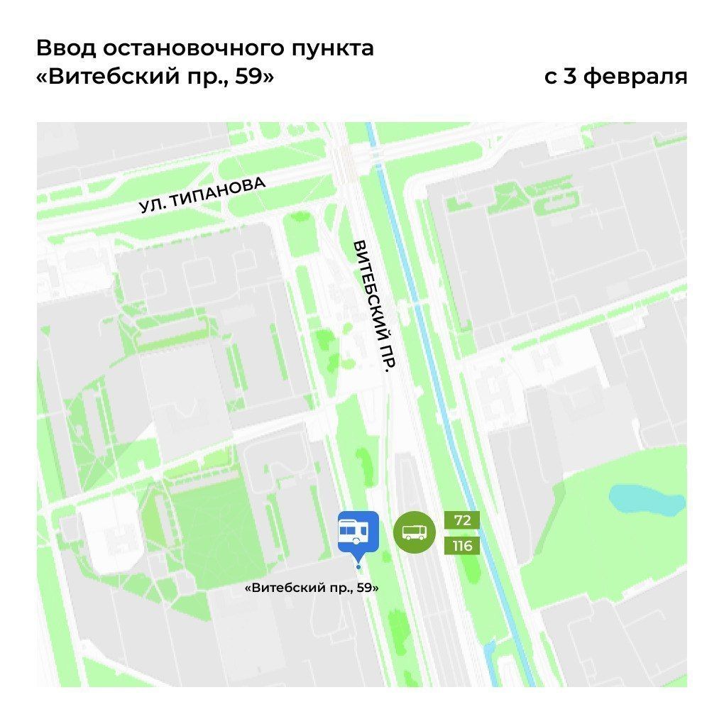 «С 3 февраля вводятся остановочные пункты в трассы автобусных маршрутов №72, 116, 231, – говорится в сообщении. – Остановочный пункт «Витебский пр., 59» в трассы автобусных маршрутов №№ 72, 116 в обоих направлениях движения; остановочный пункт «ул. Марии Кошкиной, по требованию» в трассу автобусного маршрута № 231 в обоих направлениях движения».