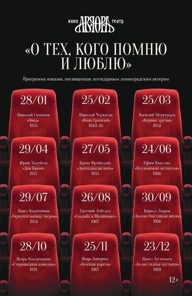 Старт цикла был дан 28 января. Он открылся показом картины «Овод» с Николаем Симоновым в главной роли. Следующий показ состоится 25 февраля: на экране «Авроры» покажут фильм «Иван Грозный» с Николаем Черкасовым.