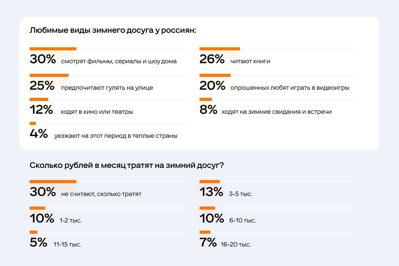 Также 26 процентов россиян проводят время за чтением книг, 25 процентов любят играть в видеоигры, ещё 12 процентов ходят в кино или театры, восемь процентов – на зимние свидания и встречи, четыре процента респондентов не любят зиму и уезжают на этот период в теплые страны.