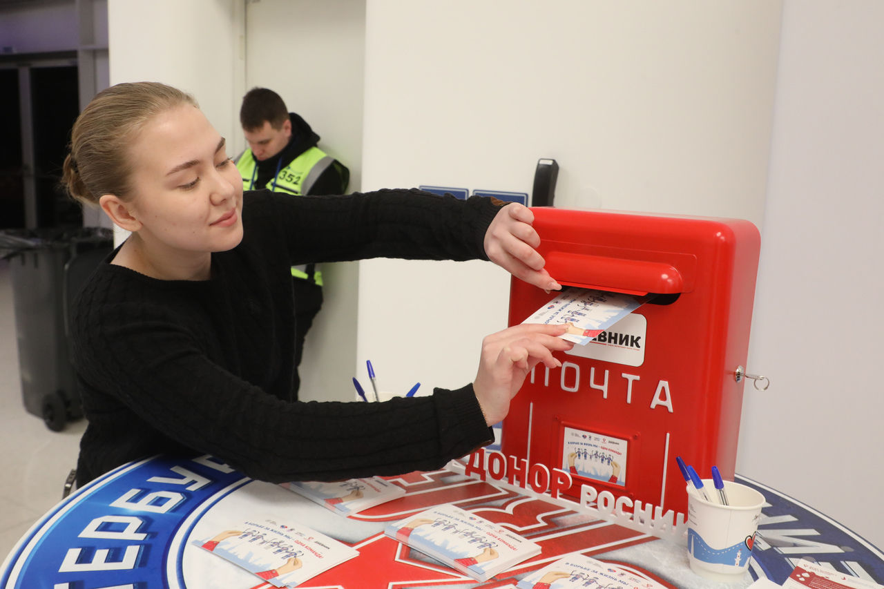 Помимо участия в «Доброй почте», каждый желающий в возрасте от 18 до 45 лет, не имеющий ограничений по состоянию здоровья, в перерывах и до хоккейного матча мог сдать мазок буккального эпителия для вступления в Федеральный регистр доноров костного мозга.