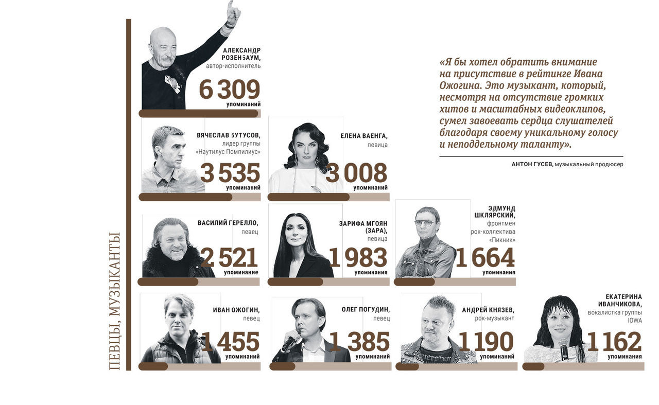 «Я бы хотел обратить внимание на присутствие в рейтинге Ивана Ожогина. Это музыкант, который, несмотря на отсутствие громких хитов и масштабных видеоклипов, сумел завоевать сердца слушателей благодаря своему уникальному голосу и неподдельному таланту», – отметил музыкальный продюсер Антон Гусев.