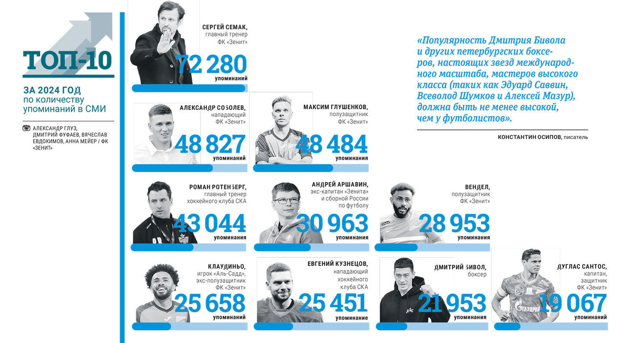 Издание «Петербургский дневник» и аналитическая система «Медиалогия» определили, каких петербургских спортсменов в 2024 году чаще всего цитировали в СМИ.