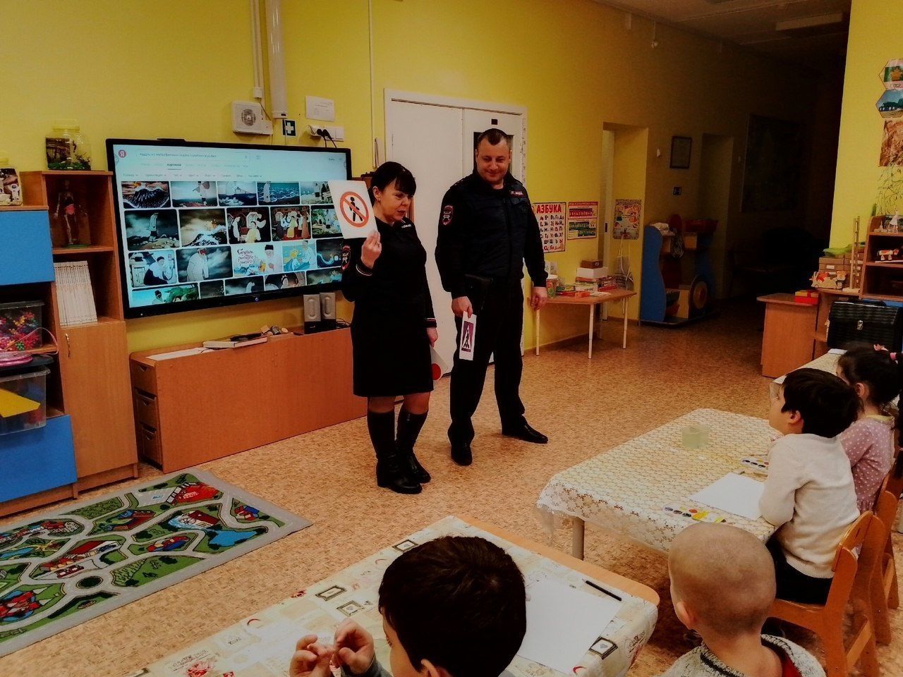 Сотрудники Госавтоинспекции проводят занятия для самых юных участников дорожного движения, обучая их основам безопасного передвижения.