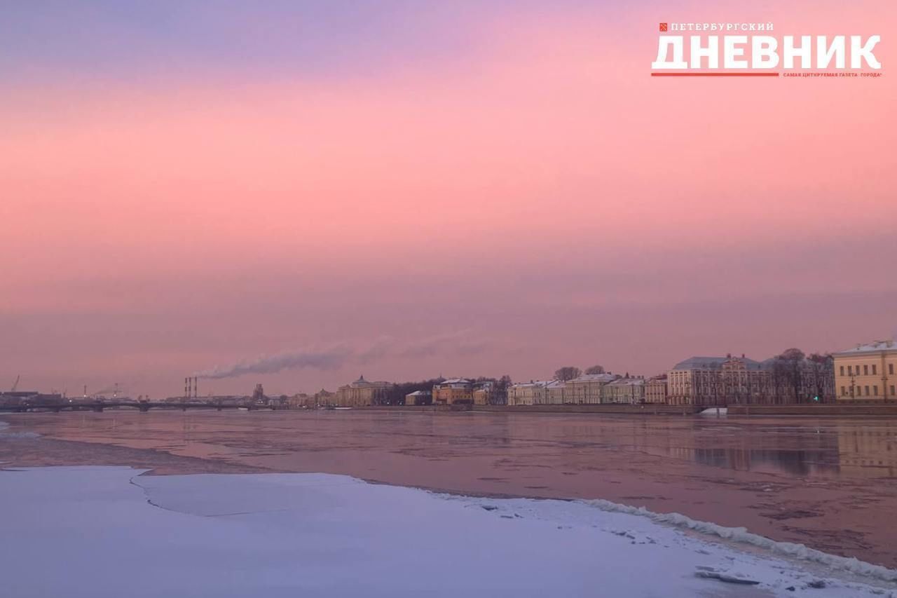 Морозный февраль подарил жителям Петербурга красивый восход. Корреспондент «Петербургского дневника» запечатлел, как небо над городом окрасилось в розовый цвет.