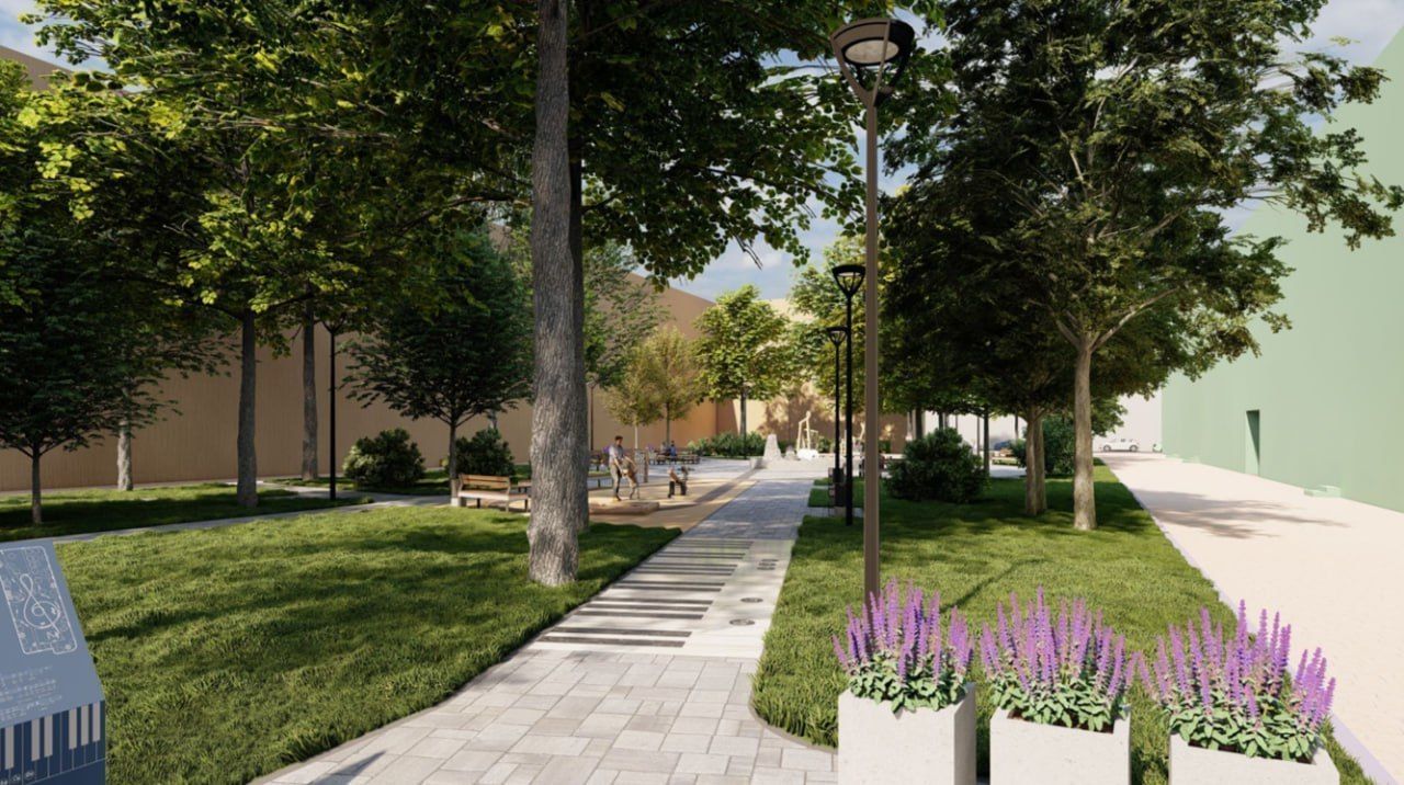 Пешеходные дорожки в сквере оформят в виде клавиш рояля и пианино. Также установят новые скамейки, обновят детскую площадку и высадят растения – липу, клен, сирень, форзицию, спирею и другие деревья и цветы. Начальная стоимость контракта составляет 23,7 млн рублей.