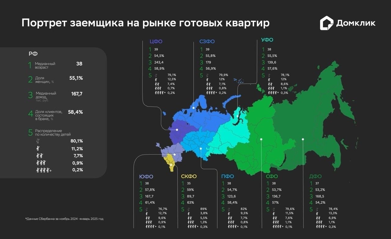 Средний возраст заемщика составил 39 лет, более половины всех ипотечных кредитов на «вторичку» были выданы женщинам. Также отмечается, что 57 процентов заёмщиков состоят в официальном браке, у 80 процентов нет детей. За год эти значения практически не поменялись.