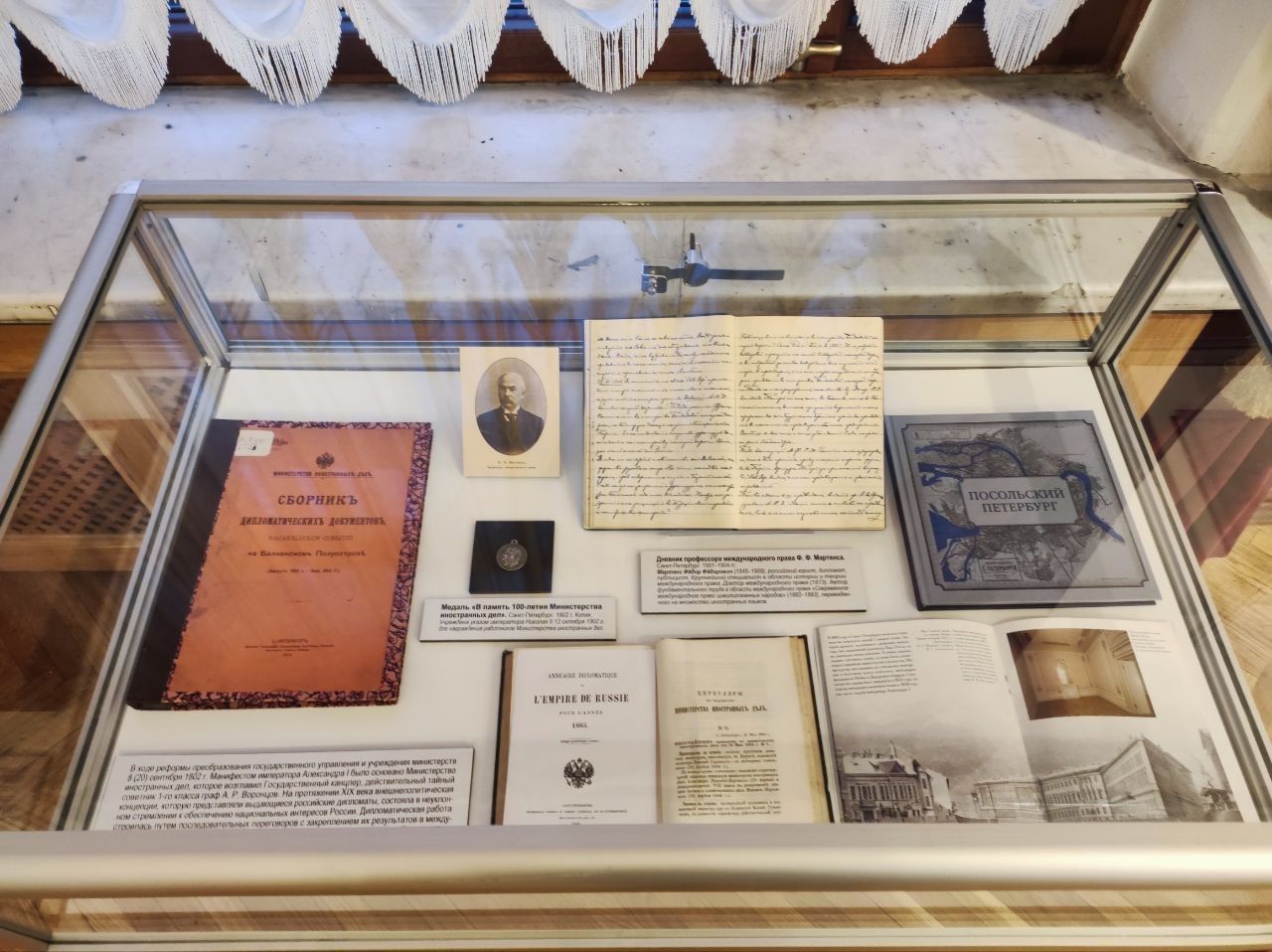 Экспозиция рассказывает о работе дипломатического корпуса в Санкт-Петербурге с начала XIX века до наших дней. Среди экспонатов представлены портреты и жизнеописания министров иностранных дел России, работавших в здании МИД у Певческого моста. Советский период дипломатической истории Петрограда – Ленинграда отражают фотоматериалы из архива внешней политики СССР, а также мемориальные предметы известных дипломатов Советского Союза.