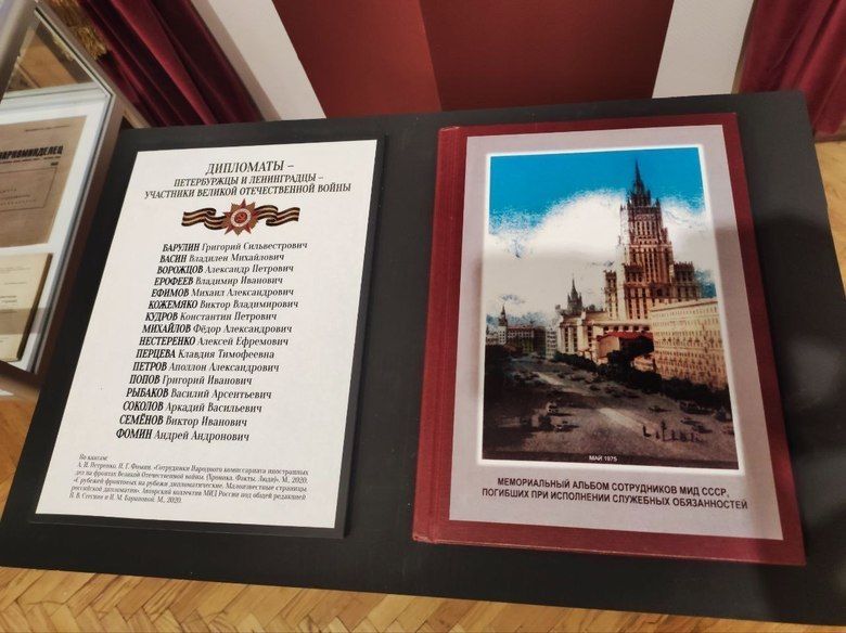 В память дипломатов – ленинградцев, участников Великой Отечественной войны, представлены имена фронтовиков, которые после Победы служили в МИД СССР и России. На витринах и стендах размещены оригиналы дипломатических документов, протокольной посуды для официальных приемов, образцы дипломатических подарков и многое другое.