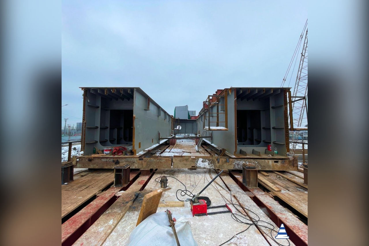 На текущий момент выполнено 50 % работ по монтажу стапелей – временных металлических конструкций, необходимых для надвижки пролетного строения. С их помощью строители уже собрали 185 тонн основных металлоконструкций и надвинули их на 12 метров в сторону железной дороги. В процессе работ используются краны грузоподъемностью 160 тонн, 100 тонн и 25 тонн.