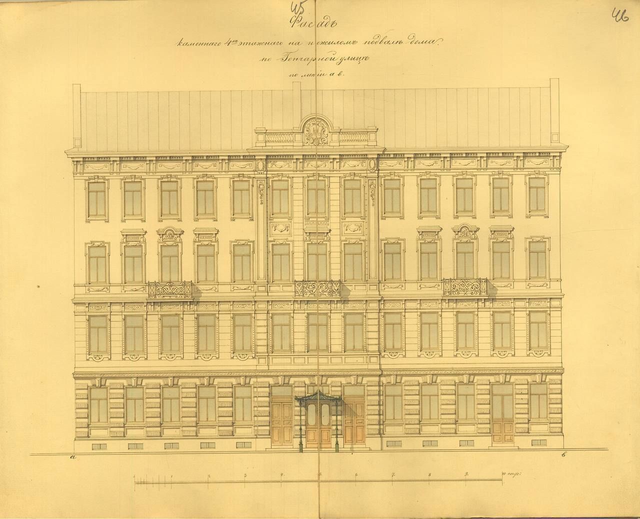 В настоящее время специалисты собирают данные об облике дома № 107Б по Невскому проспекту, с лицевым фасадом, выходящим на Гончарную улицу. Проводится изучение архивных и иконографических материалов.