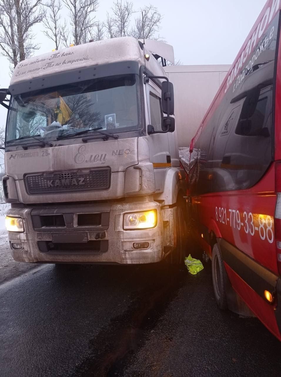 По предварительным данным, водитель грузового автомобиля, выезжая с автозаправочной станции, перекрыл движение по автомобильной дороге Р-21 «Кола». В результате в фуру врезался микроавтобус.