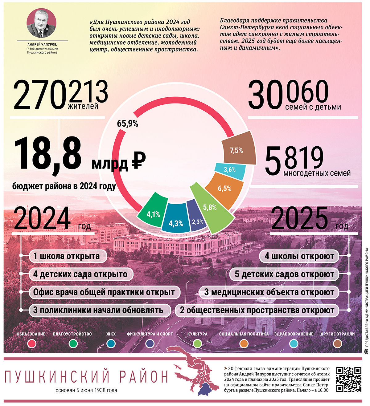 «Для Пушкинского района 2024 год был очень успешным и плодотворным: открыты новые детские сады, школа, медицинское отделение, молодежный центр, общественные пространства. Благодаря поддержке правительства Санкт-Петербурга ввод социальных объектов идет синхронно с жилым строительством. 2025 год будет еще более насыщенным и динамичным», – отметил глава администрации Пушкинского района Андрей Чапуров.