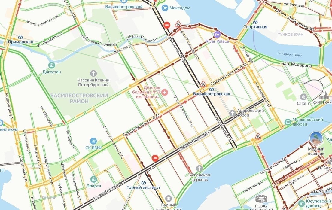 Сервис «Яндекс.Пробки» указывал на то, что полностью были закрыты Большой проспект Васильевского острова, 8-9-я линии и Уральская улица, а также частично – 23-я линия Васильевского острова.