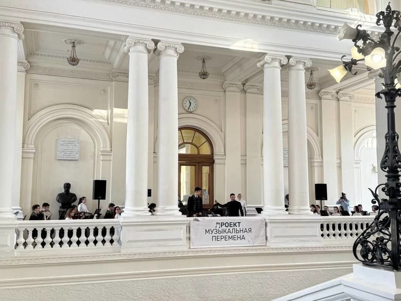 Импровизированная сцена разместилась между бюстами основателя университета, бывшего председателя правительства России Сергея Витте и первого директора Андрея Гагарина. Первый считал, что воспитывать инженера без гуманитарной подготовки безнравственно и губительно для страны, второй был основателем первого симфонического оркестра в университете.